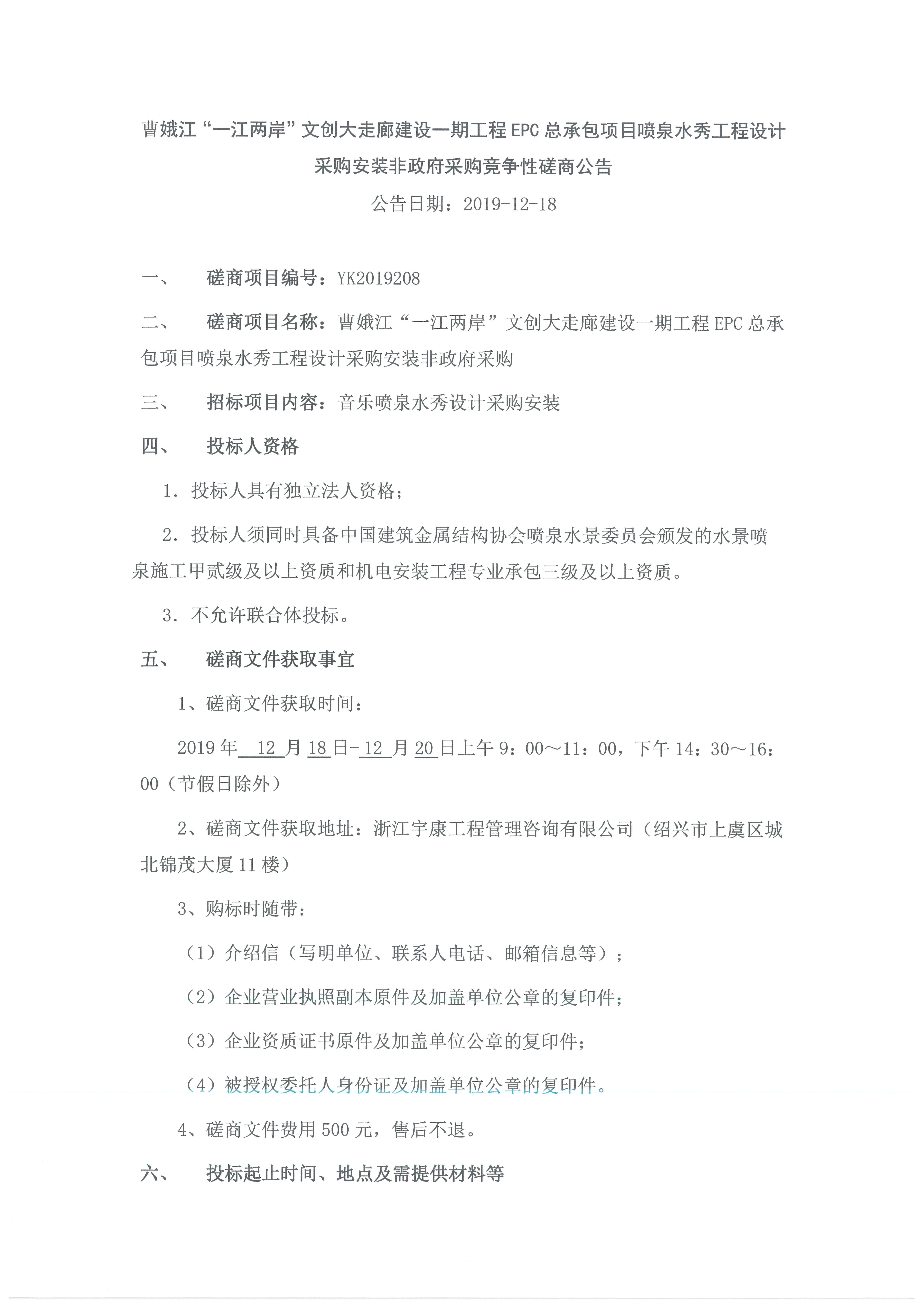 曹娥江“一江兩岸”文創大走廊建設一期工程EPC總承包項目噴泉水秀工程設計采購安裝非政府采購競爭性磋商公告