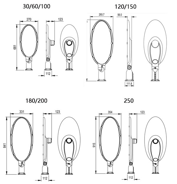 681*270*123(30/60/100W) 716*294*112(120/150W) 841*331*123(180/200W) 915*354*123(250W) |