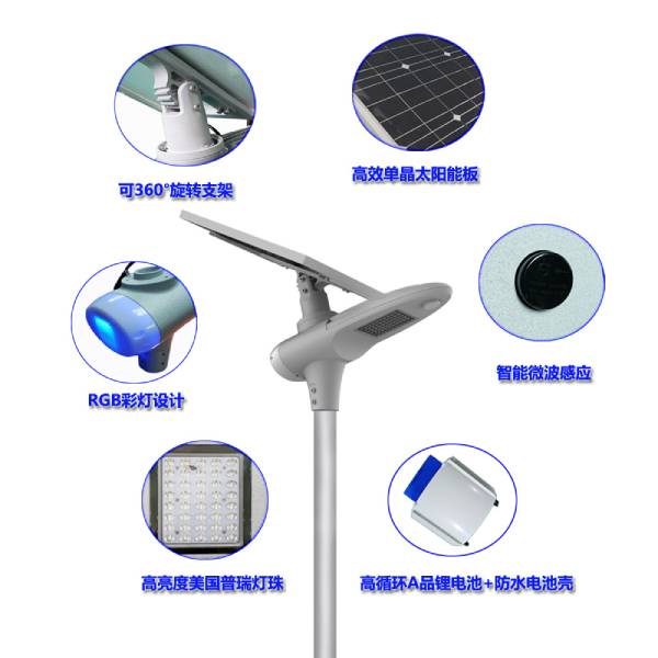 弟二代一體化太陽能路燈采用高效單晶光伏板,智能MPPT控制器,長壽命鋰電池,高光效燈珠,集于一體化設計,安裝使用方便,并擁有微波感應和RGB彩燈設計,實現(xiàn)多功能亮燈