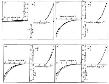 表1為三種樣品老化前、老化80,150和200h的Vf和Ir值,老化條件為常溫900mA,其中Vf為350mA下的電壓值,Ir為反向 10V下的漏電流值,通常反向漏電流Ir在反向5V下測量,為比較結果,選擇更苛刻的條件,在反向10V下測量。圖1是三種樣品老化前、老化80,150 和200h后的I-V特性曲線,分別為圖1(a)~(d)。圖1(a)顯示了A,B,C三種樣品在老化前都有較好的I-V特性,其開啟電壓在2.5V左 右,反向10V下電流都在10-9A數量級。老化200h后三種樣品在反向10V下其漏電流Ir都比老化前明顯增加。表1說明了經大電流200h老化后相 同反壓(-10V)下B樣品的漏電流最小,A樣品次之,C樣品最大,而且隨著老化時間的推移,三種樣品在相同反壓下的漏電流差別越來越大。 InGaNMQWLED在老化后正向電壓稍有升高,是因為大電流長時間老化使得裸露的n電極(鋁)局部氧化從而導致接觸電阻變大造成。老化后漏電變大的原 因為:InGaNLEDpn結耗盡層的寬度主要由p型層載流子濃度決定,芯片經過大電流長時間老化后,由于Mg-H復合體的分解,受主Mg被重激活,使得 p型載流子濃度升高,導致耗盡層變窄,反向偏置時勢壘區(qū)變薄,隧道擊穿成分增多,反向電流增加;另外,芯片經過大電流長時間老化后,量子阱區(qū)缺陷密度增 加,反向偏置時有缺陷和陷阱輔助隧穿引起漏電流,B,A,C三種樣品熱導率依次降低,所以在老化時產生的缺陷和陷阱密度依次降低,因此在相同反壓下三種樣 品漏電流依次增大(如表1和圖1所示)。