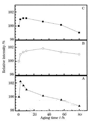 圖3是350mA電流下各樣品相對光強隨老化時間的變化關系,三種樣品都以老化前的光強為100%。從圖3中可以看 到,A,B,C三種樣品光強都隨老化時間的增加而先增大后減小,其中以A樣品在老化2h后光強增加最多,隨后隨著老化的進行光強就開始減小了,而B,C樣 品分別在老化了32h,10h光強才開始下降,并且下降的趨勢比A樣品慢。而且可看出在常溫900mA老化后A,B,C三種樣品350mA下光強都經過一 個最大值然后減小,C樣品減小最多,A次之,B樣品的光強值雖在減小,但仍然比老化前的值大。此現象的原因為:MOCVD方法生長的GaN有部分受主Mg 由于與H形成Mg-H復合體而鈍化,Mg的激活率很低,導致空穴濃度較低,在大電流老化中,有部分Mg-H鍵被打斷而使受主Mg被激活,從而空穴濃度增 加,可能載流子濃度變得更加匹配,發(fā)光效率變高。另一方面,老化使GaN材料中位錯、缺陷等非輻射復合中心密度升高,從而發(fā)光效率降低,光強下降。這兩種 機制相互競爭,在老化初期,Mg受主激活機制占主導,因此同等電流下三種樣品光強都增加,隨著老化的進行,位錯、缺陷等非輻射復合中心增生機制逐漸占主 導,因此大電流老化一段時間后三種樣品光強都減小。三種樣品光衰的快慢不同可能是因為三種樣品量子阱的應力狀態(tài)及支撐基板熱導率不一樣造成非輻射復合中心 增生的程度不一樣引起的。