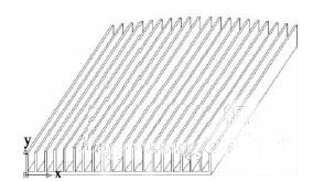 自然對流的散熱強度不僅取決于流速、溫差和流體物性,還取決于速度場和溫度場的協(xié)同。從數(shù)值計算結(jié)果分析來看,為了提高散熱器的散熱能力,降低基板底面 最高溫度可以有兩種方法:(1)把散熱器做得更大,散熱器體積越大,其熱容量越大,其散熱面積也越大,還等同于降低了單位熱流密度。但缺點是增加成本,浪 費金屬材料;(2)通過改變空氣擾流流場線,讓速度場和溫度場的協(xié)同性更好。把原有散熱器模型加工成如圖9所示,讓空氣在浮力的作用下可以在散熱器中間實 現(xiàn)上下流通,擾流肋片,增大空氣擾流面積。這樣不僅可以破壞散熱器上面的滯流區(qū)域,還增大了空氣流通量,更充分冷卻散熱器。