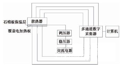為了確保數(shù)值計算所選的數(shù)學(xué)模型、網(wǎng)格劃分、計算方法和邊界條件的可靠性,我們做了實驗研究。實驗測量過程在一個不受干擾的封閉空間進行,實驗系統(tǒng)圖如圖5所示。在試驗中,散熱器基板底面覆以電加熱板,用以模擬LED燈組產(chǎn)生的熱量。并在基板與電加熱板間填涂導(dǎo)熱硅脂,隔絕空氣熱阻。電加熱板下方用石棉板絕熱使電加熱板產(chǎn)生的熱量全部由散熱器散出。