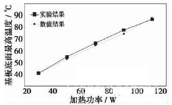 本文中實驗加熱功率間隔為20W,從30~110W的范圍內(nèi)進行,基板底面最高溫度分別為41、55、67、78和87℃。對應(yīng)的數(shù)值計算基板底面最高 溫度分別為41、53、65、75和88℃。從實驗和數(shù)值計算結(jié)果可以看出隨著加熱功率的提高,散熱器的基板底面最高溫度也隨之提高,成線性變化。實驗結(jié) 果和數(shù)值計算結(jié)果的對比如圖6所示,相對誤差率在1%范圍內(nèi),說明數(shù)值分析結(jié)果是可靠的。