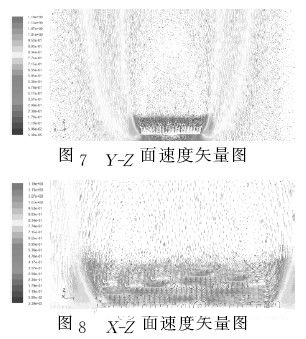 散熱器自然對流過程中,基板底面不斷地提供熱量,由于散熱器材料良好的導(dǎo)熱性,熱量使散熱器溫度不斷提高。靠近散熱器周圍的空氣受熱,密度變小,與遠離散熱器的空氣形成密度差,產(chǎn)生了浮力。在散熱過程中,數(shù)值計算結(jié)果可以得到在Y-Z面中的速度矢量場如圖7所示??梢灾庇^地看出空氣因為散熱器的基板底面 在浮力的作用下,擾流冷卻散熱器的時候,空氣直接從散熱器四周往上走,卻不能進入散熱器肋片間對散熱器進行冷卻。在電加熱板的加熱量與散熱器的散熱量平衡 時,散熱器肋片都成了等溫壁面。速度又是由溫度差引起的,速度小導(dǎo)致空氣的浮生力小于粘性力。散熱器周圍的冷空氣從散熱器四周往上運動,到最終混為一起的 時候,在散熱器肋片的上方形成了一個很大的滯流區(qū)域。從圖8 X-Z面的速度矢量圖可以看出在肋片方向上的滯流區(qū)域里的兩端形成了兩個小渦,阻止了周圍空 氣進入散熱器肋片里。又因為在粘性力的作用下,這個滯流區(qū)域里空氣流速非常小,所以在這樣的結(jié)構(gòu)下,散熱器的肋片就沒有充分發(fā)揮出自然對流的散熱效果。