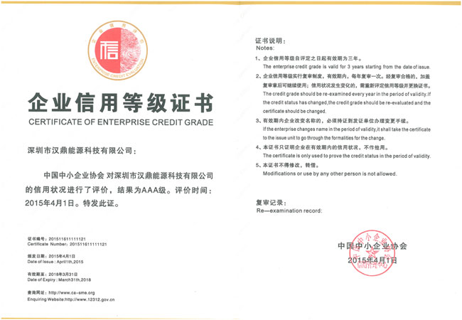 漢鼎LED照明:深圳市漢鼎能源科技有限公司被中國中小企業(yè)協(xié)會信用管理中心評為“AAA級”企業(yè)信用等級。